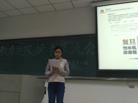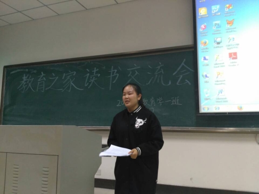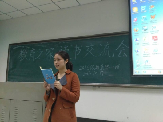 古人云:“至乐莫如读书,至要莫如教子”。读书是一个充满收获的过程,可以使软弱的性格变得坚强,使迷茫的人变得坚定,使浮躁的心变得沉静,可谓世上最快乐、最奇妙之事。为了加强同学们专业知识基础,营造浓郁书香的班级氛围,10月17日晚9点,2016级教育学专业(1)班在博学楼举办了“教育之家”读书交流会。教育系党总支书记杨瑞旭老师参加并指导了本次交流会,学生班主任江唱主持本次交流会。
