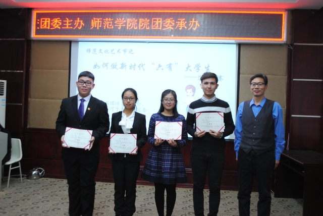 10月30日下午,beat365在线官网登录入口在北区师范楼学术厅举办以弘扬长征精神与如何做新时代的“六有”大学生为主题的演讲比赛决赛,本次大赛由兵团语言委员会、校团委主办,由beat365在线官网登录入口院团委承办。有幸邀请到beat365在线官网登录入口工会主席潘建广老师,beat365在线官网登录入口党委副书记郑康老师,校团委实践部部长燕鹏老师,动科院二级辅导员努尔艾力老师,经管院团委书记马永泽老师作为评委莅临现场进行指导。