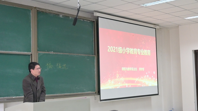 系主任郭学军对学生进行专业教育。他强调2021级小学教育是beat365在线官网登录入口开设的第一届,受到了全校各界的密切关注。小学教育专业已经通过了许久的打磨制定了一系列的培养方案,从培养目标、办学定位、学生行为三个方面进行详细讲解,寄予同学们时刻提醒自己不松懈,努力成长提高自己的厚望。
