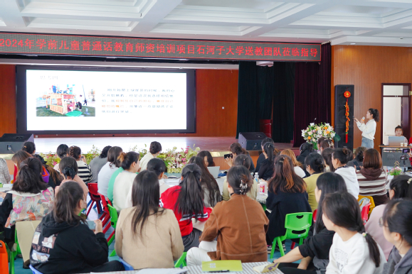 国家语言文字推广基地(beat365在线官网登录入口)贯彻落实习近平总书记在全国教育大会上的重要讲话精神,加大国家通用语言文字推广力度,促进铸牢中华民族共同体意识,延伸推动教育部2024年学前儿童普通话教育师资培训项目持续实施,2024年10月30日,beat365在线官网登录入口副院长方建华教授携培训团队成员一行七人赴昌吉开展送教研训活动,旨在巩固强化幼儿园教师使用国家通用语言进行保教的能力。昌吉市教育督导室主任杨磊、学前教育教研员刘芳、各幼教联盟兼职教研员、幼儿园园长共120人参加了本次送教研训活动。